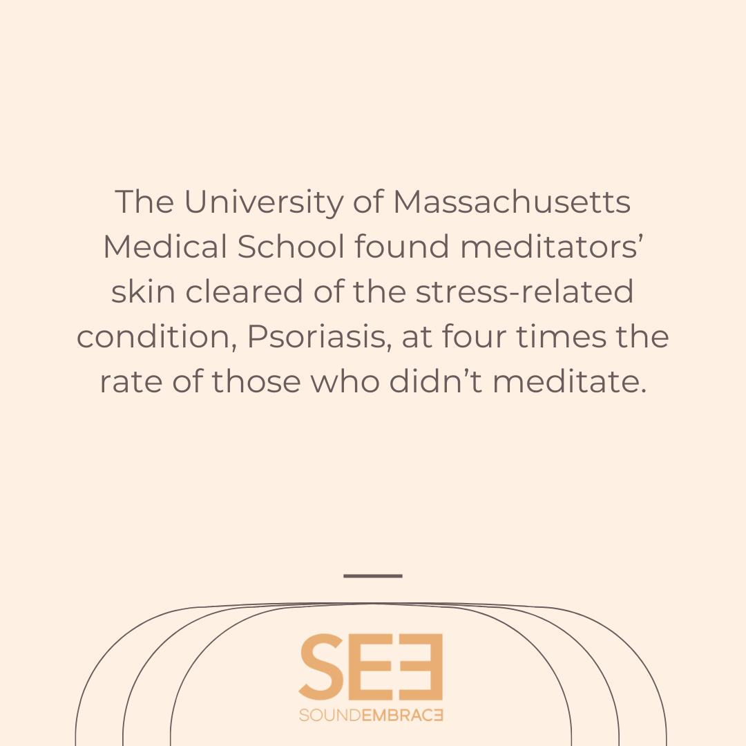 The University of Massachusetts Medical School found meditators’ skin cleared of the stress-related condition, Psoriasis, at four times the rate of those who didn’t meditate.